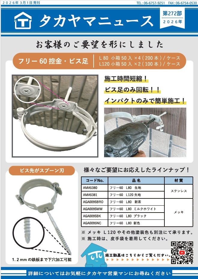 タカヤマニュース タカヤマニュース 2026年3月号 2026年03月10日 【隠れたヒット商品】 フリー60控金・ビス足 従来品との比較動画 画像をクリック↑ < prev 臨時休業のお知らせ カテゴリ すべて お知らせタカヤマニュース展示会出展荷物追跡 新着記事 2025年07月14日 タカヤマニュース タカヤマニュース 2025年7月号 2024年07月01日 タカヤマニュース タカヤマニュース 7月号 2024年10月01日 タカヤマニュース タカヤマニュース 10月号 2025年11月04日 タカヤマニュース タカヤマニュース 2025年11月号 2024年08月01日 タカヤマニュース タカヤマニュース 8月号