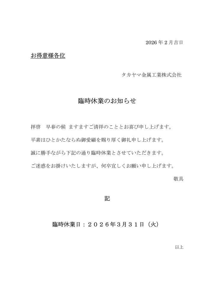 お知らせ 臨時休業のお知らせ 2026年02月27日 < prev タカヤマニュース 2026年2月号 カテゴリ すべて お知らせタカヤマニュース展示会出展荷物追跡 新着記事 2023年07月28日 お知らせ タカヤマ金属工業㈱ SNS リンク集 2025年01月20日 お知らせ 根太レスVS床パネルシステムとの施工比較動画 2026年01月30日 お知らせ 製品名称変更のお知らせ 2025年04月18日 お知らせ荷物追跡 納品書伝票番号(荷物追跡番号)の桁数変更について 2023年07月21日 お知らせ HPリニューアル公開しました